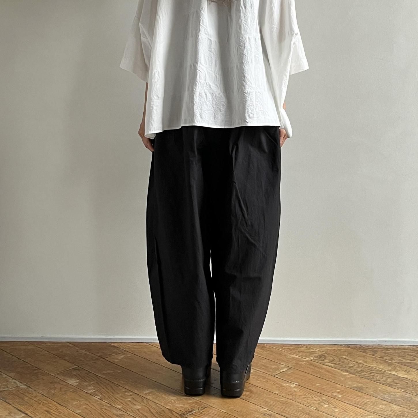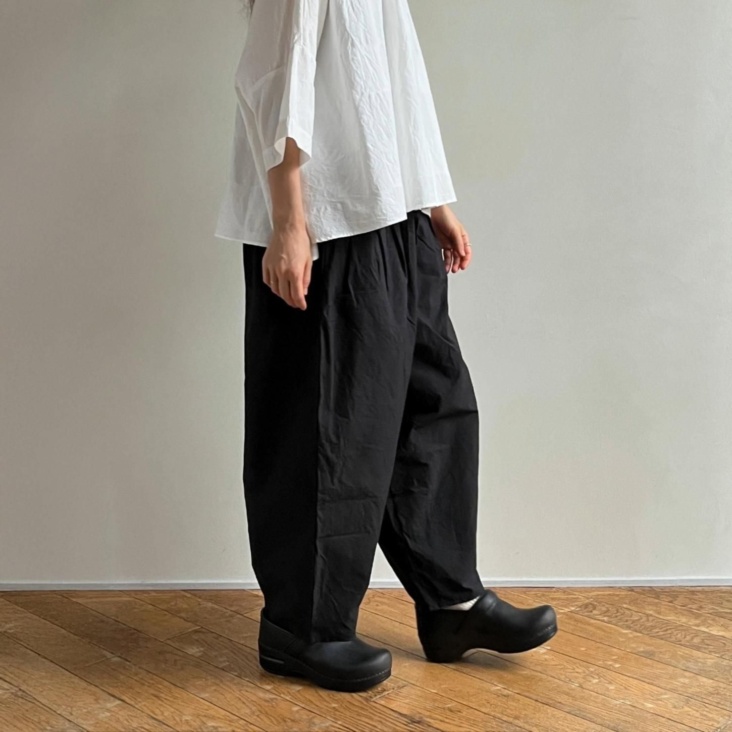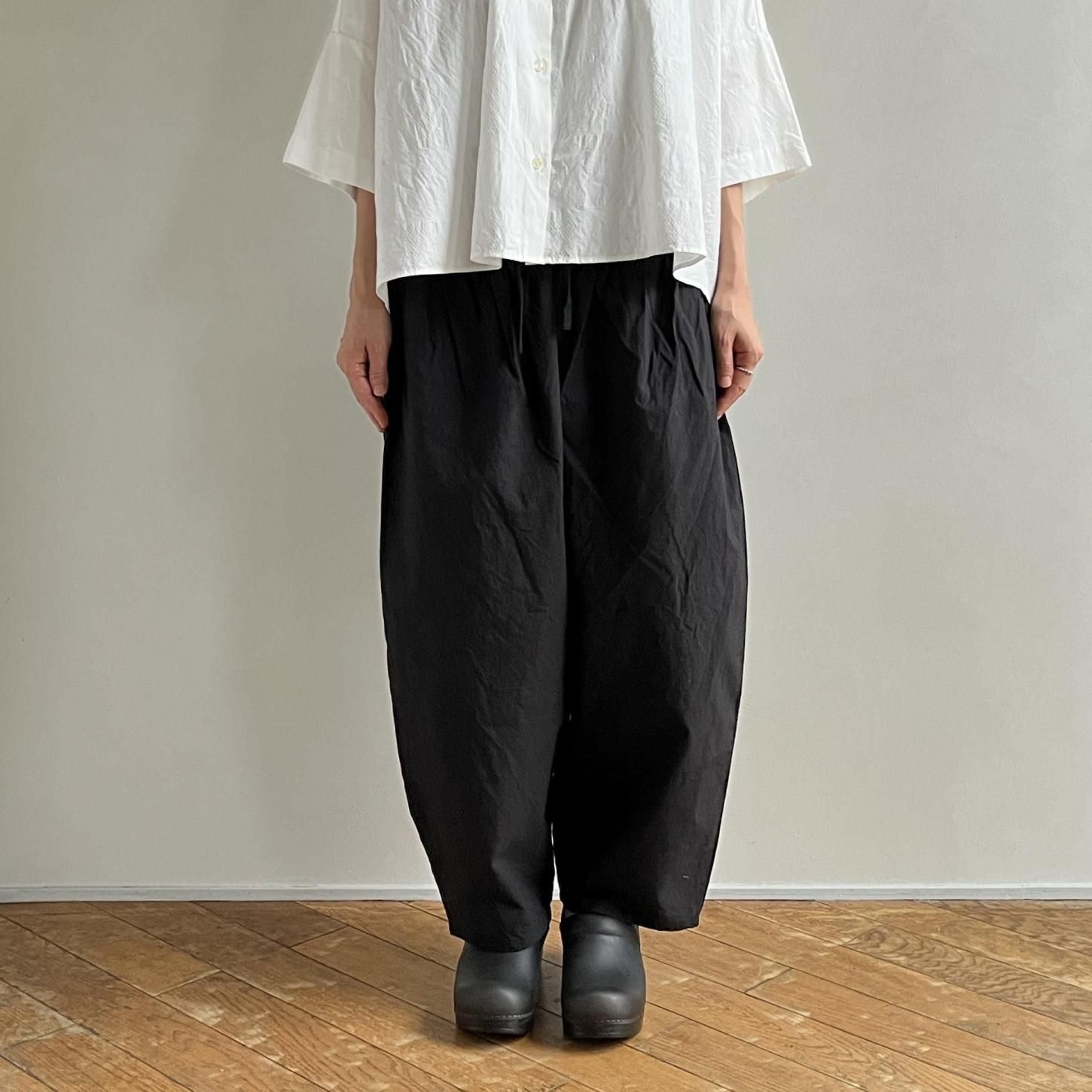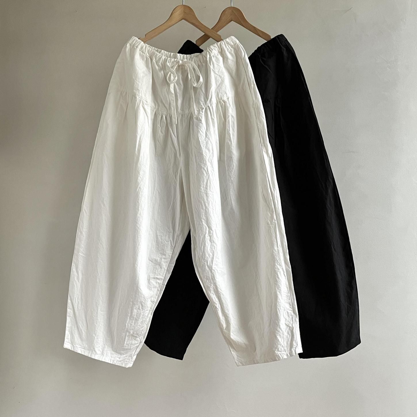 履きやすく、どんなスタイルにも合わせやすいからこそ、気づけばまた手に取りたくなる存在です。腰まわりにたっぷりと寄せたギャザーから生まれる立体感と、裾に向かってゆるやかにテーパードしたシルエット。リラックスした履き心地でありながら、装いをきゅっと引き締めてくれるデザインが魅力です。定番であることの安心感といつ手にしても感じられる新鮮さ。長く愛される理由をぜひ履き心地から感じてみてください。