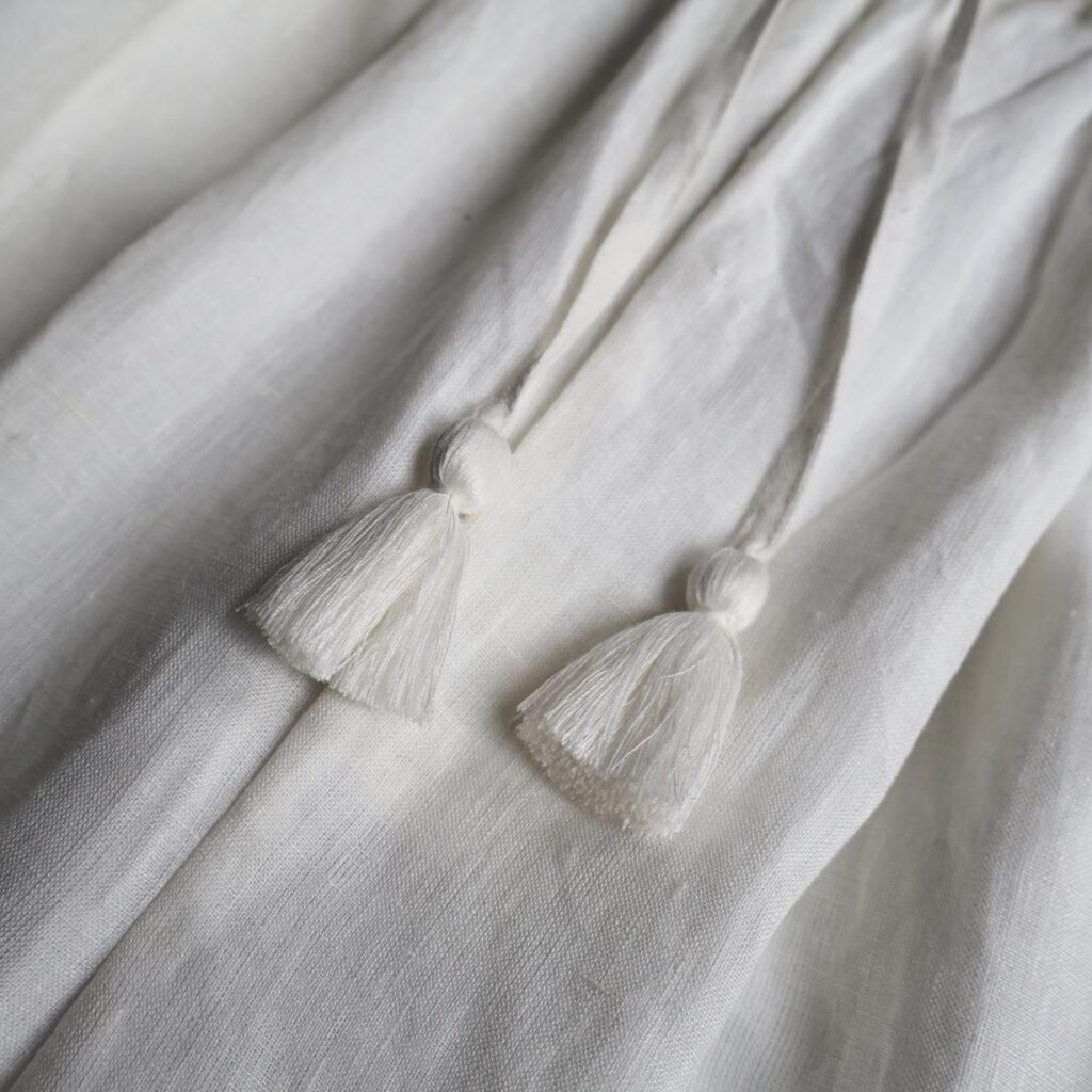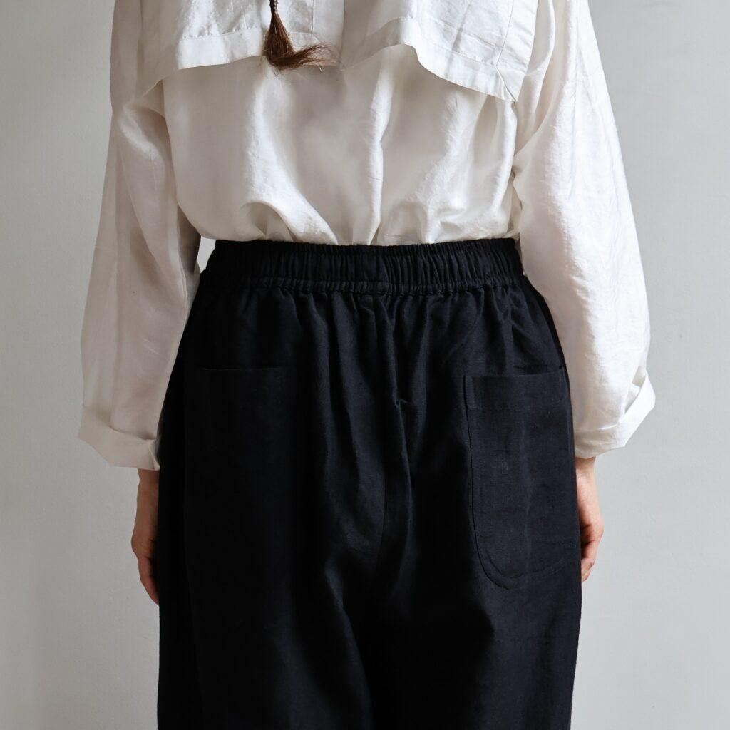 手紡ぎ・手織りによるカディリネンを使ったタックパンツ。素朴な風合いと通気性のよさを持ちながら、リネン特有の落ち感があり、軽やかに穿ける一本です。ウエストにはタックを入れ、体のラインを拾わないゆとりあるシルエットに。総ゴム仕様で紐による調整も可能なので、快適さと扱いやすさを兼ね備えています。