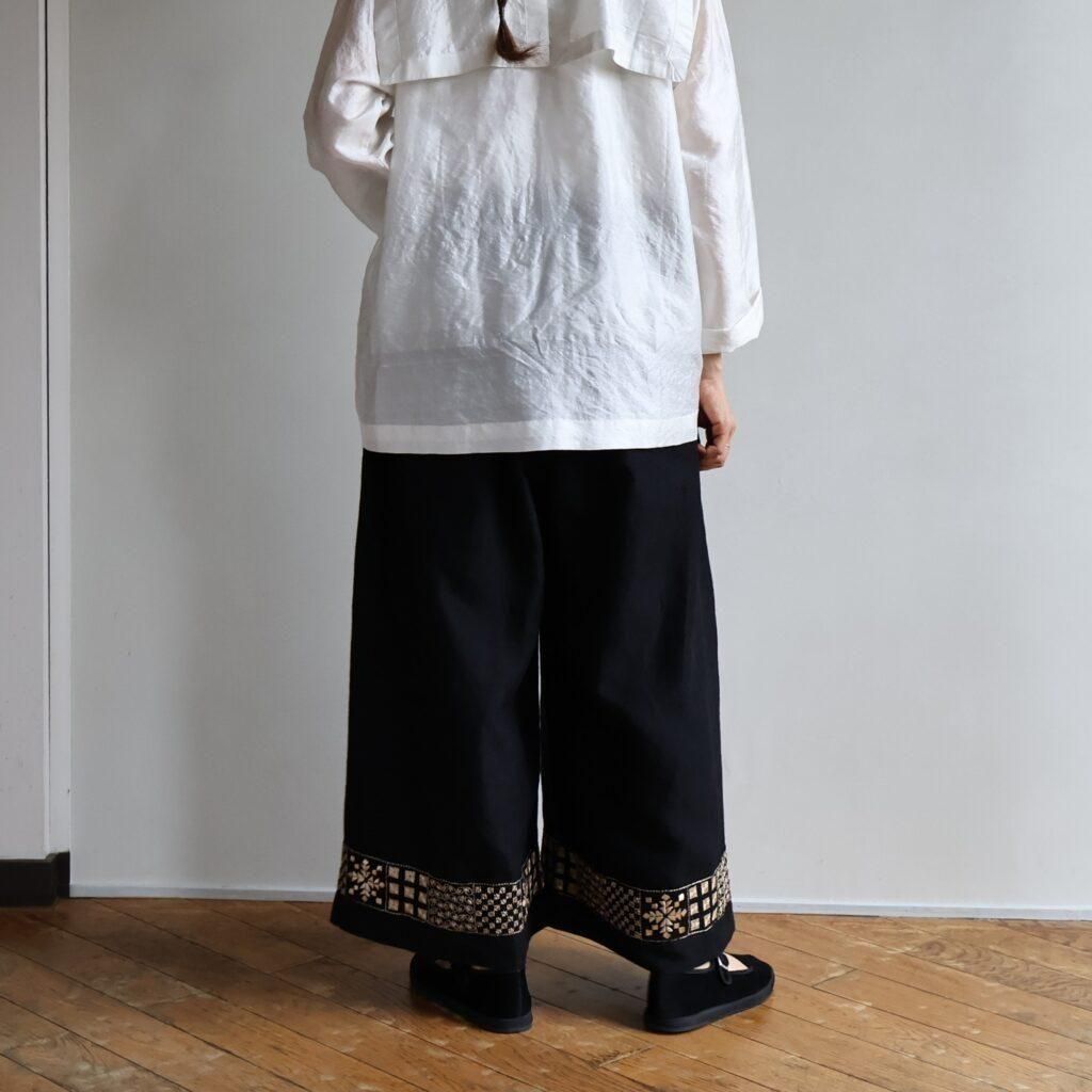 裾には幾何学模様や植物を思わせる刺繍を贅沢にあしらい、シンプルな中に洗練されたアクセントをプラス。手仕事の温かみを感じながらも、日常の着こなしにはもちろん、特別なシーンにも映えるデザインです。ブラックはシックに、オフホワイトは軽やかに。カラーによって異なる表情を楽しめます。