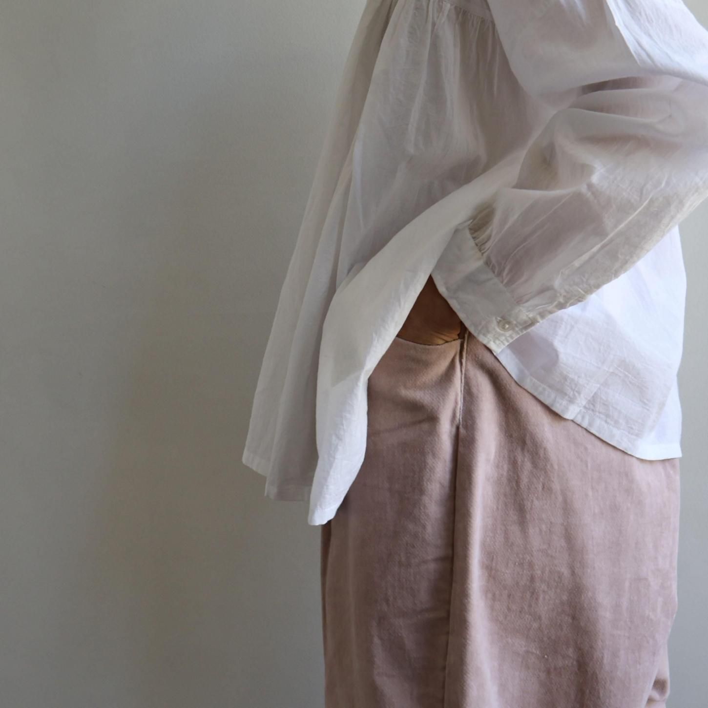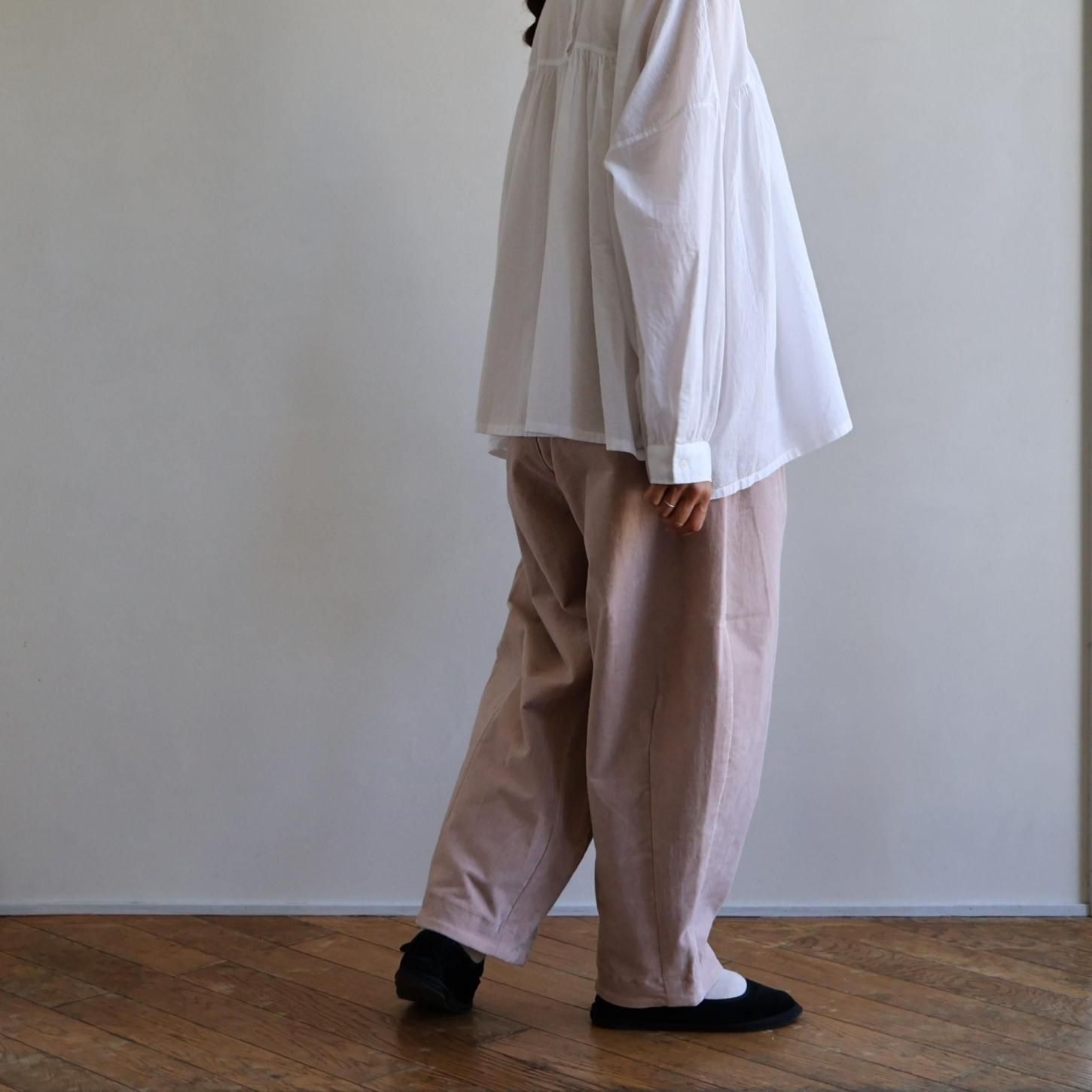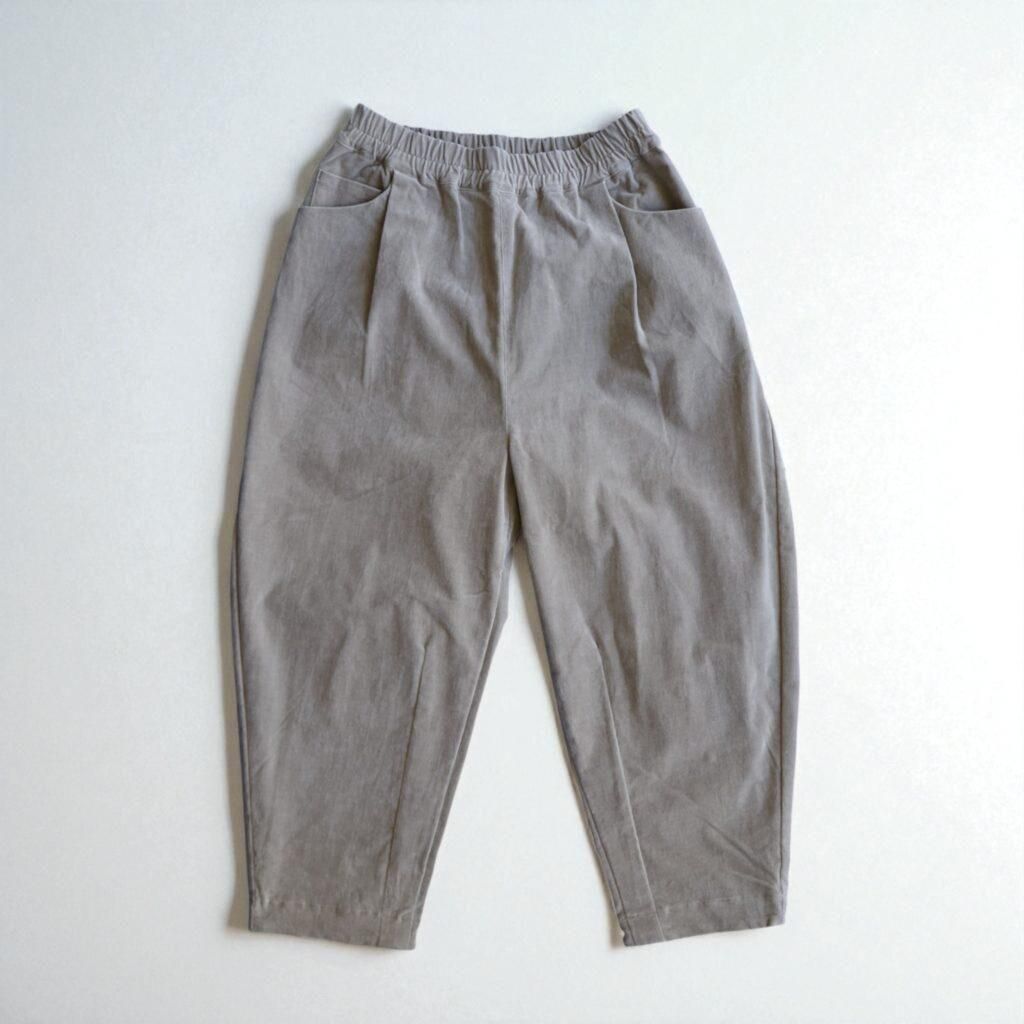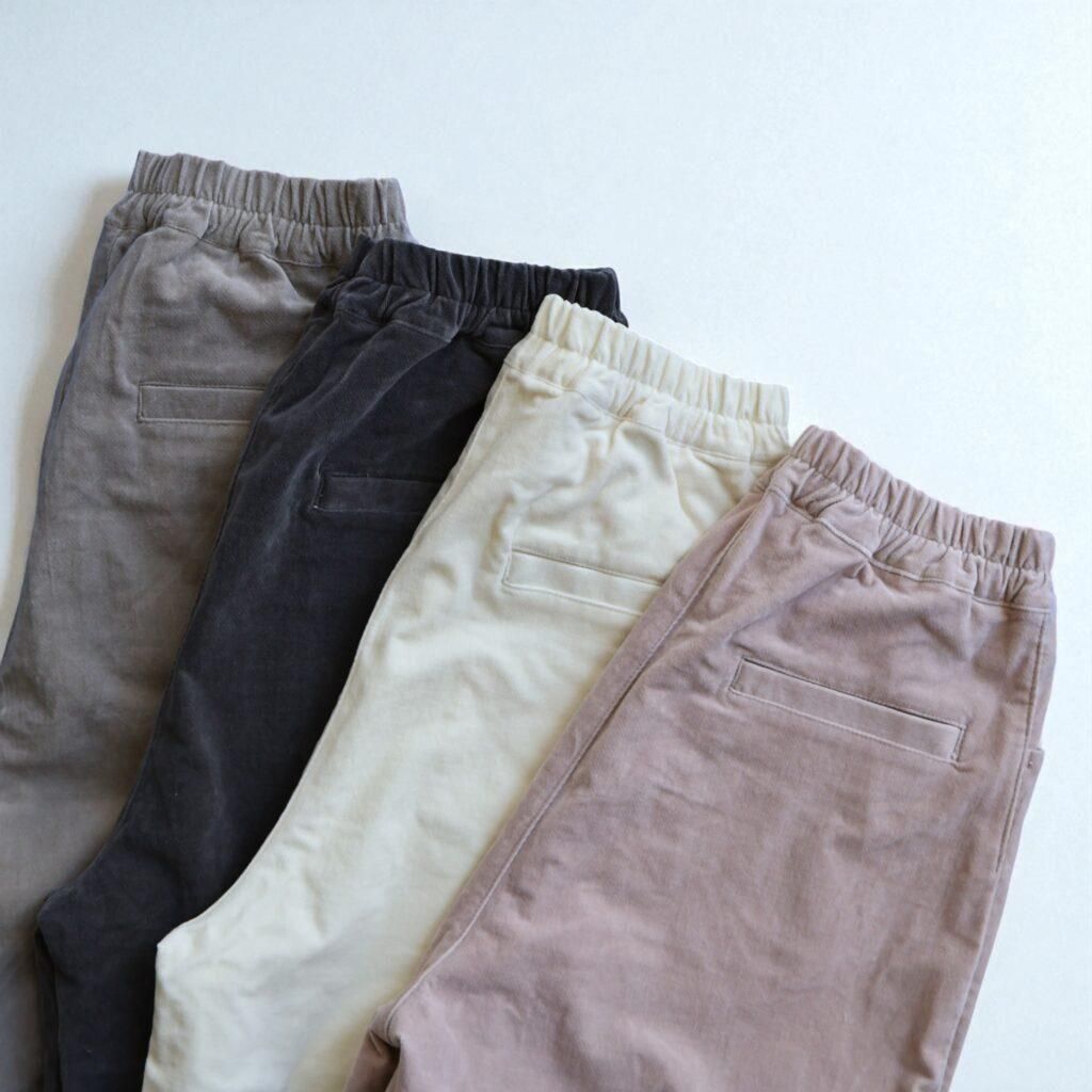アイテムについて:柔らかな微起毛コットンを使ったウォーム感たっぷりなパンツです。織物の産地でもある群馬県桐生でつくられる”桐七炊き染め”を施した生地を使用。熟練の職人の手により染めと洗いを何度も繰り返すことで、ヴィンテージ感のある風合いが生まれます。ウエスト下にタックを施したゆったりシルエットながら、裾にダーツを入れて足もとのボリュームはセーブしています。