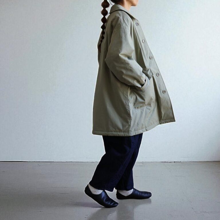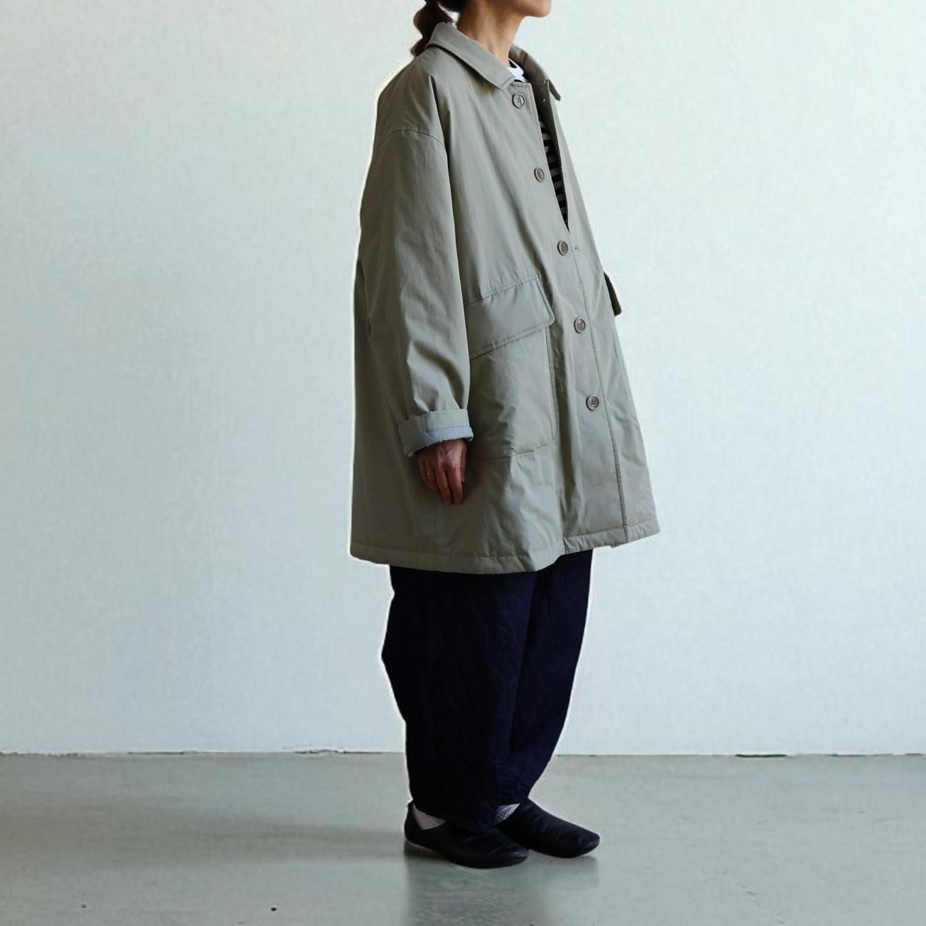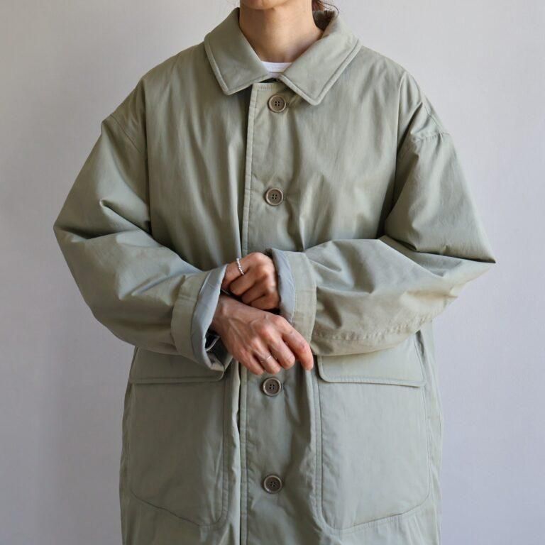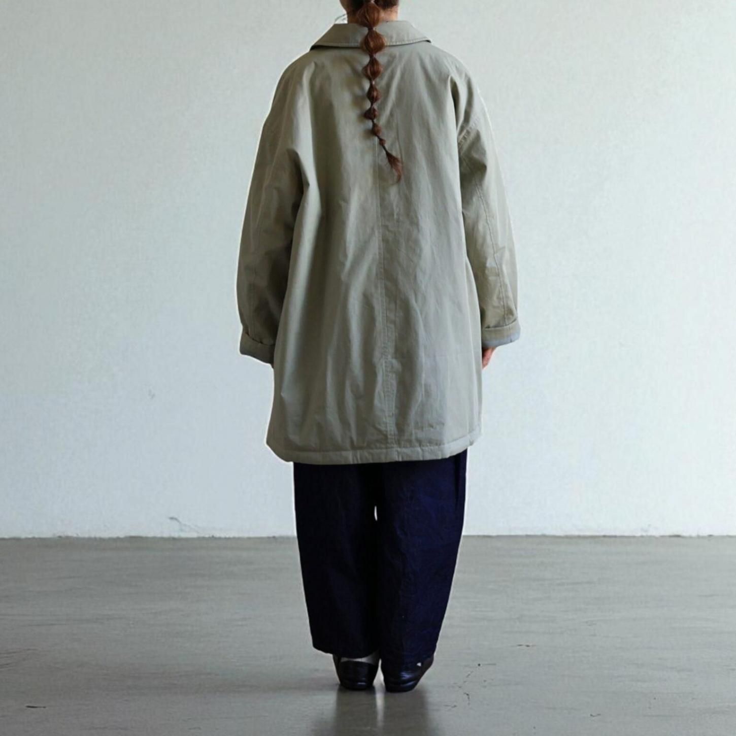 アイテムについて:軽くて暖かな薄手の中綿入りアウターです。表地にはコットン100%のタイプライター素材を使用。地厚になりがちな中綿は薄く入れているため、着ぶくれしにくいのが特徴です。身幅がとてもゆったりとしたつくりで、ローゲージニットなど厚めのアイテムとの合わせにも対応。軽量仕上がりでさっと着やすく、普段使いのアウターとして重宝します。少し肌寒い春先まで活躍してくれるアイテムです。