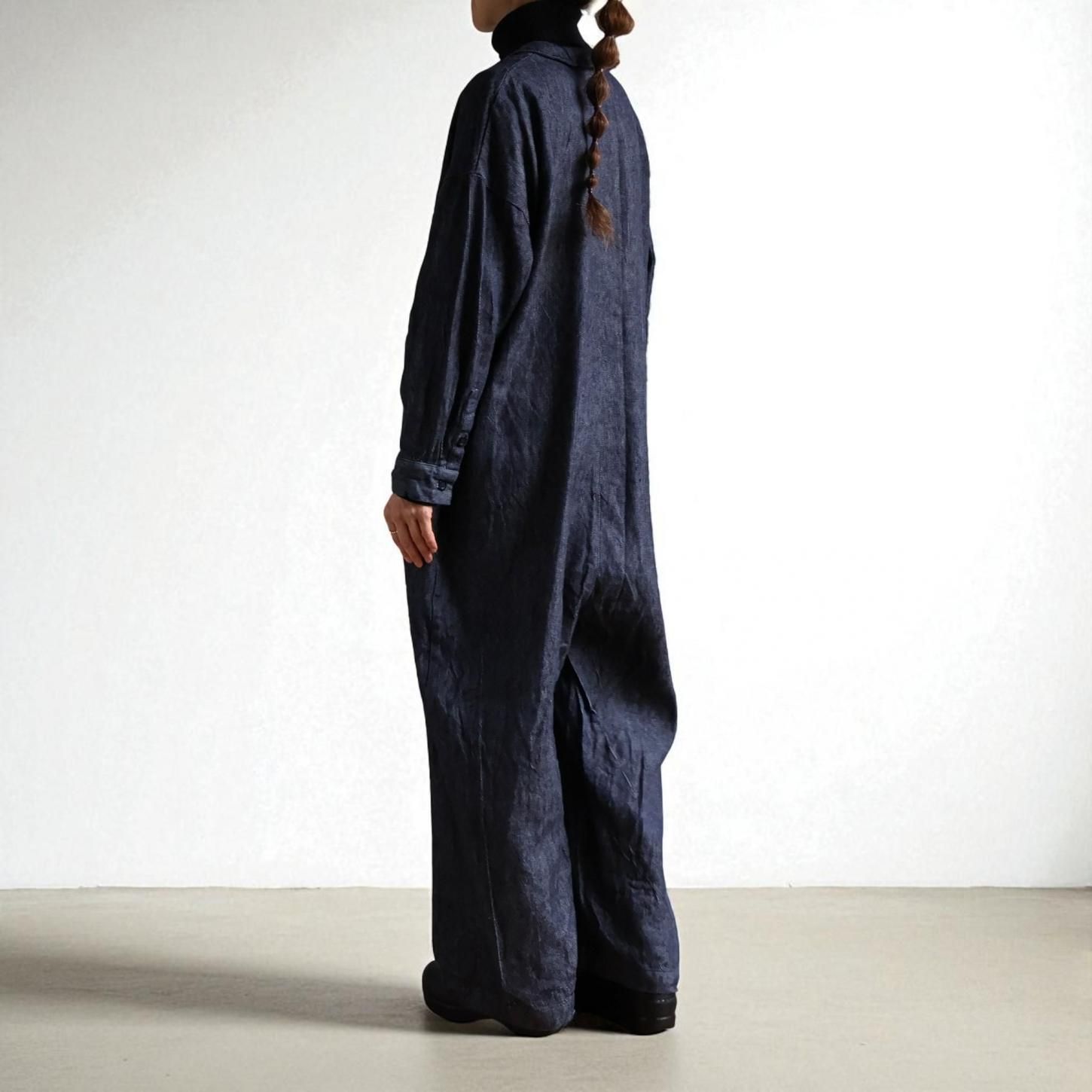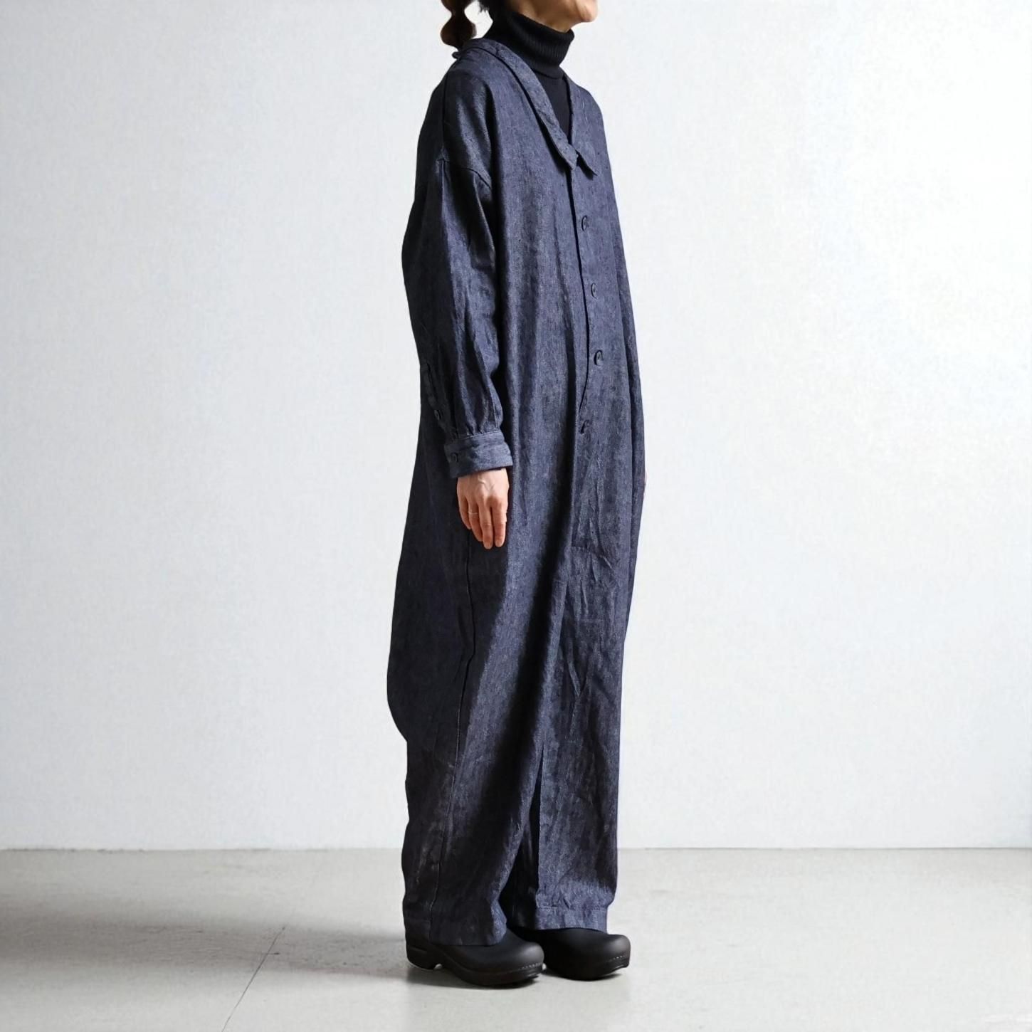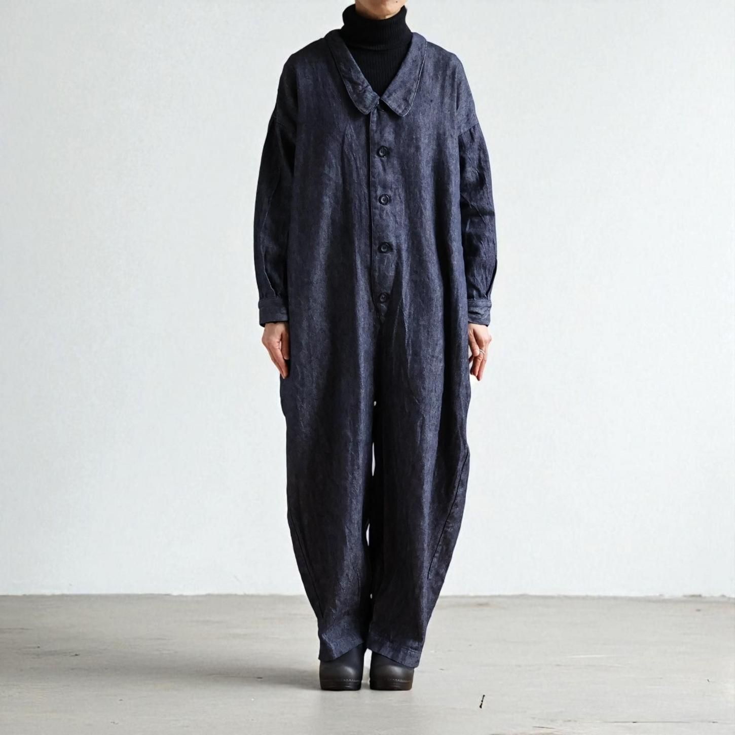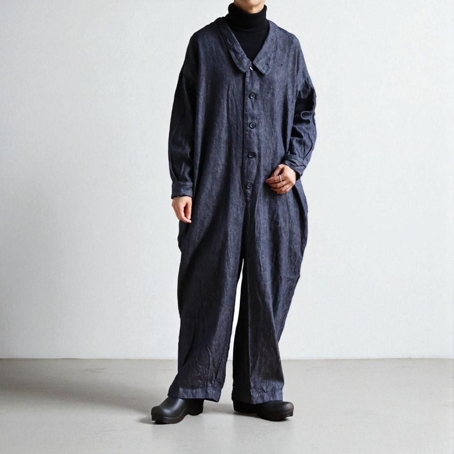 アイテムについて:深めのネックがポイントのオールインワン。ゆったりとしたシルエットと深めのネックが女性らしい印象を引き立てバランスよく仕上がっています。多ボタンもさり気ないアクセントに。胸の途中まで釦を開けてインナーを見せる着こなしやカーディガンを羽織った重ね着もおすすめです。