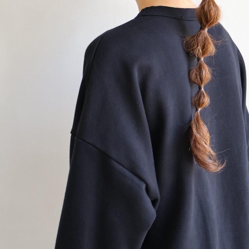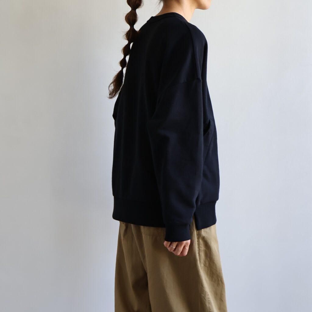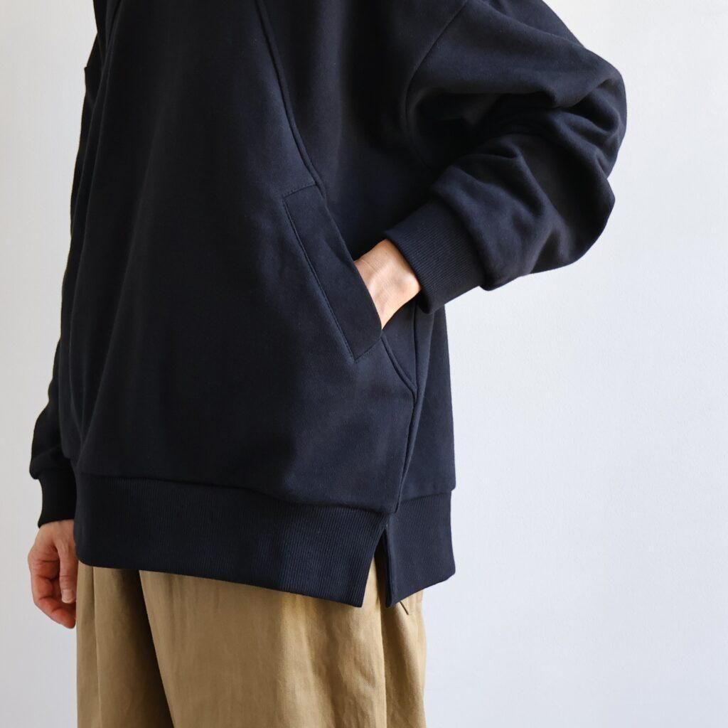 アイテムについて:身頃に切り替えを入れてボリュームを出したプルオーバーです。たっぷりとした身幅に肩まわりはドロップショルダーでゆったりとさせてオーバーサイズに仕上げています。ウエスト位置に縁取ったポケットがポイント。ソフトな肌ざわりで伸縮性が高く動きやすい裏毛素材で秋から春先まで長く活躍してくれます。