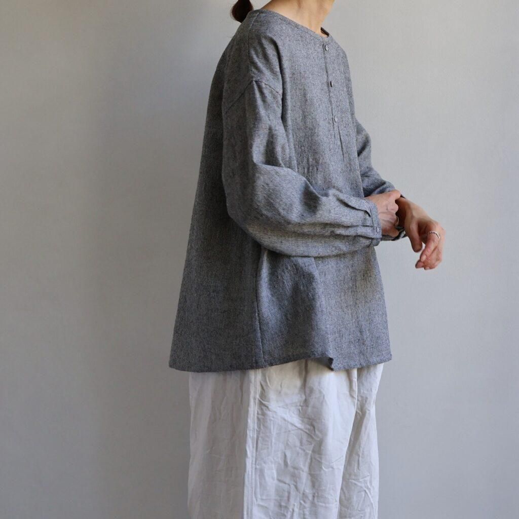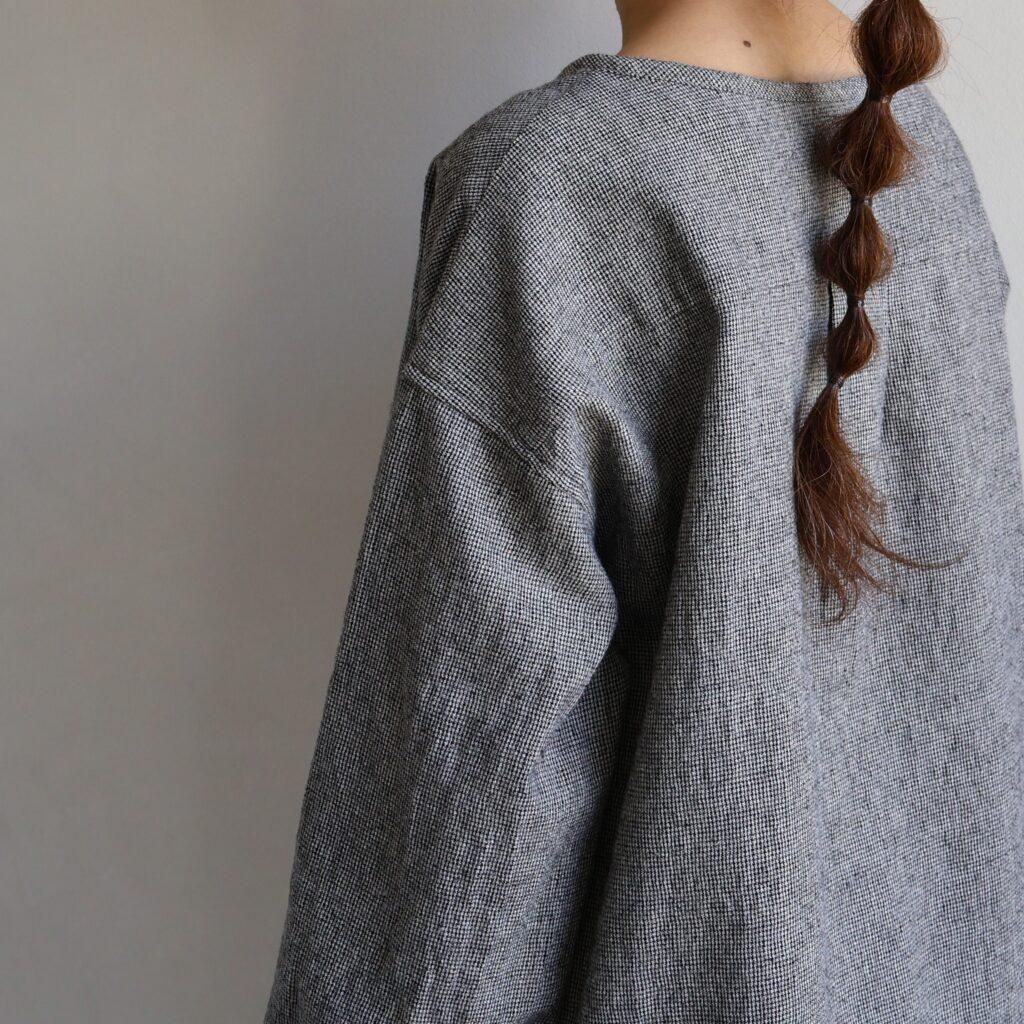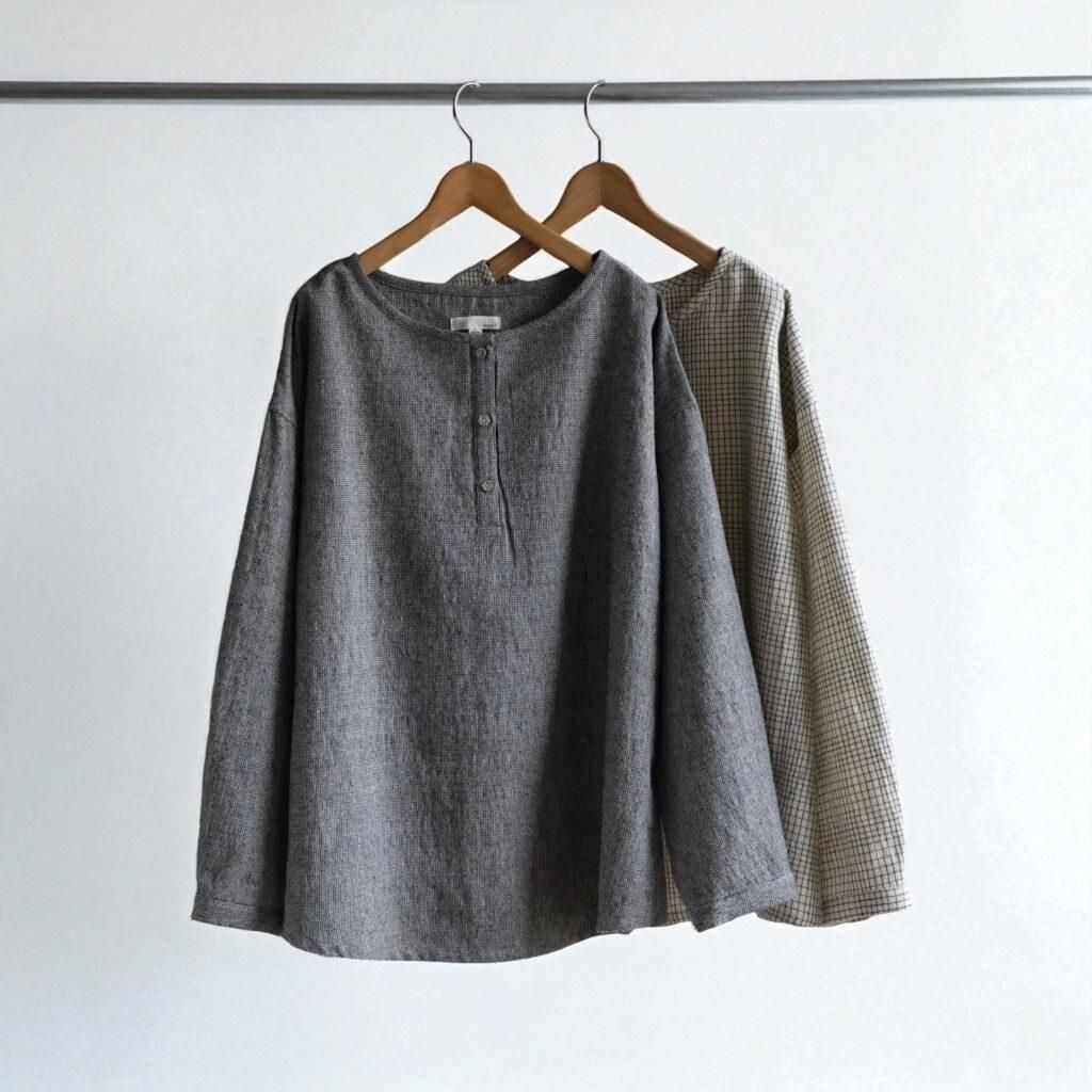 アイテムについて:余白を持ったサイズ感でゆったりと着られるオーバーシャツ。あたたかみのあるウール素材にふっくらとやわらかな質感をもたらすコットン素材を混紡し、印象的なチェック柄を凹凸のある表面感がなじませてくれます。ヘンリーネックのカジュアルなデザインに少しだけ肩を落としたリラックス感のあるシルエット。ゆるやかにラウンドした裾でボトム合わせも自然にきまります。