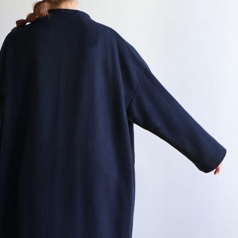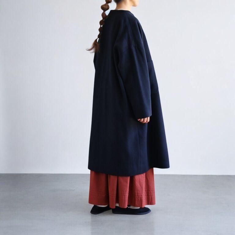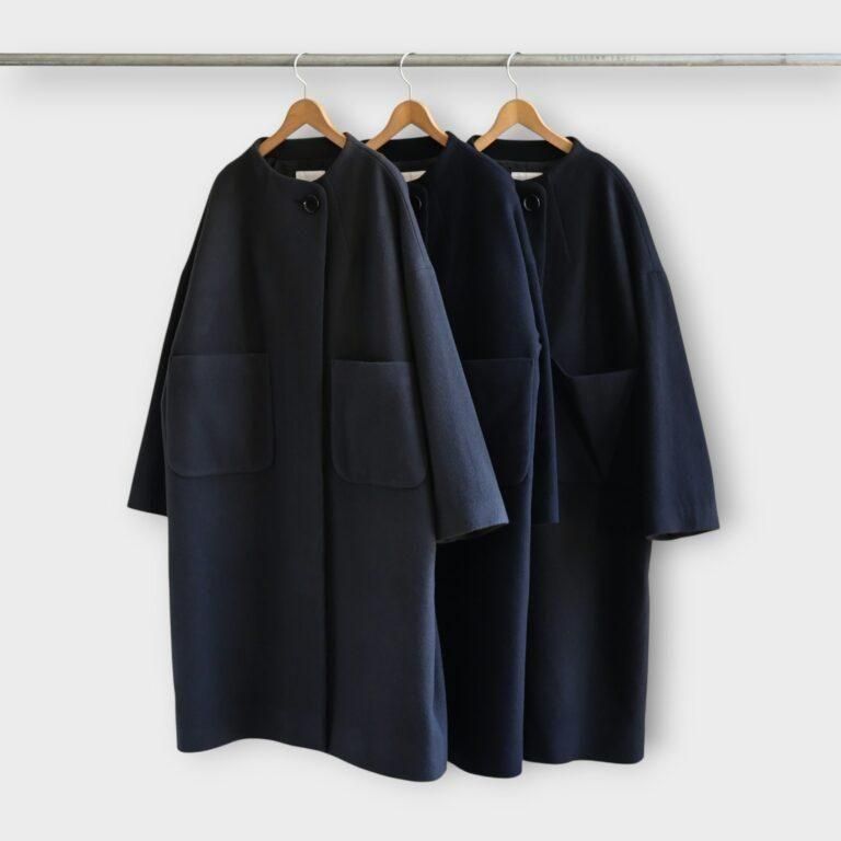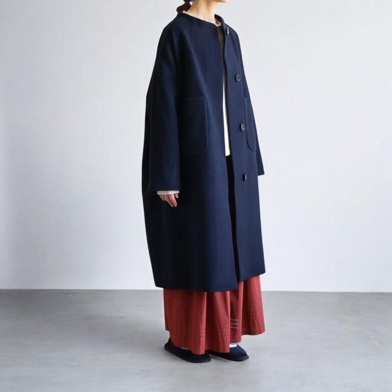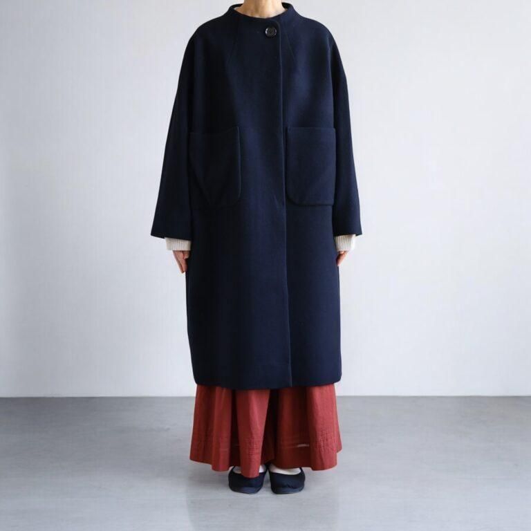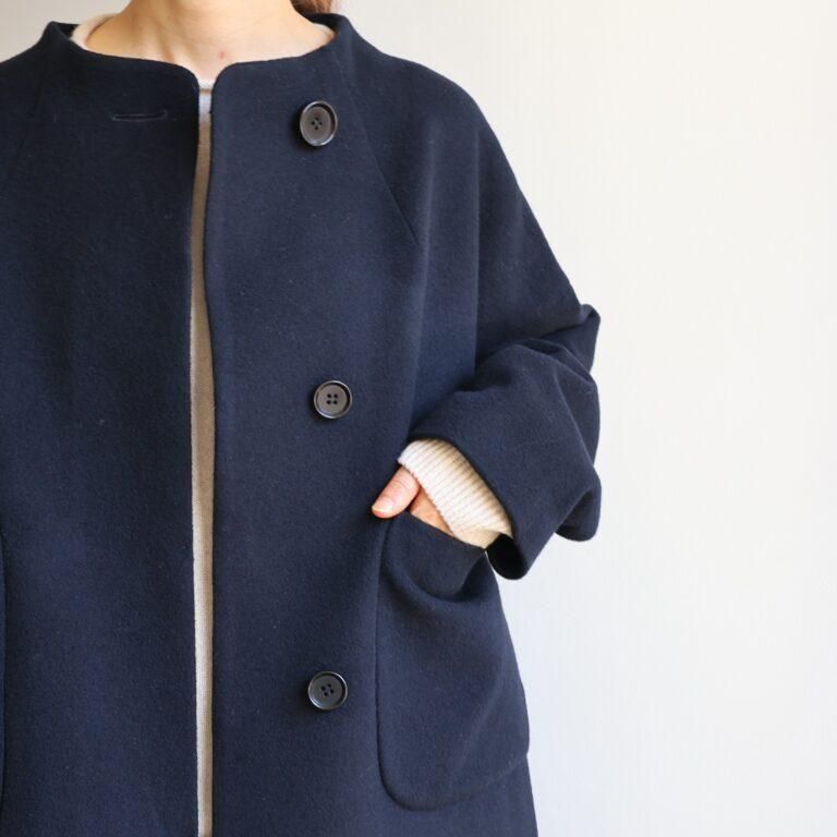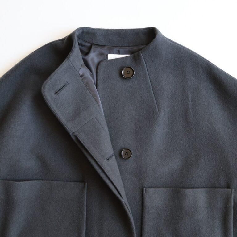 アイテム:首元にわずかに立ち上がりをもたせたモックネックのようなデザインが特徴のラウンドネックコート。丸みのあるラインが首元をやさしく包み、上品な印象を引き立ててくれます。一番上のボタンはアクセントとして見せ、その下は比翼仕立ててでボタンをすっきりと隠したミニマルなデザイン。前を留めても開けても、美しいラインを保ちます。素材にはしなやかで保温性のあるウールメルトンを使用。しっかりとした厚みがありながら、軽くなめらかな表面感が冬の空気に映える一枚です。静かな存在感のあるデザインはシーンを選ばす、どんなスタイルにも自然に馴染みます。