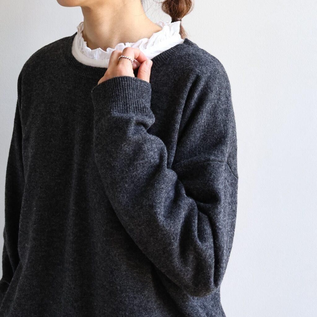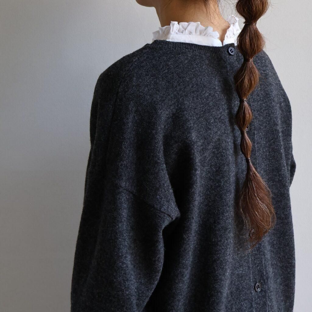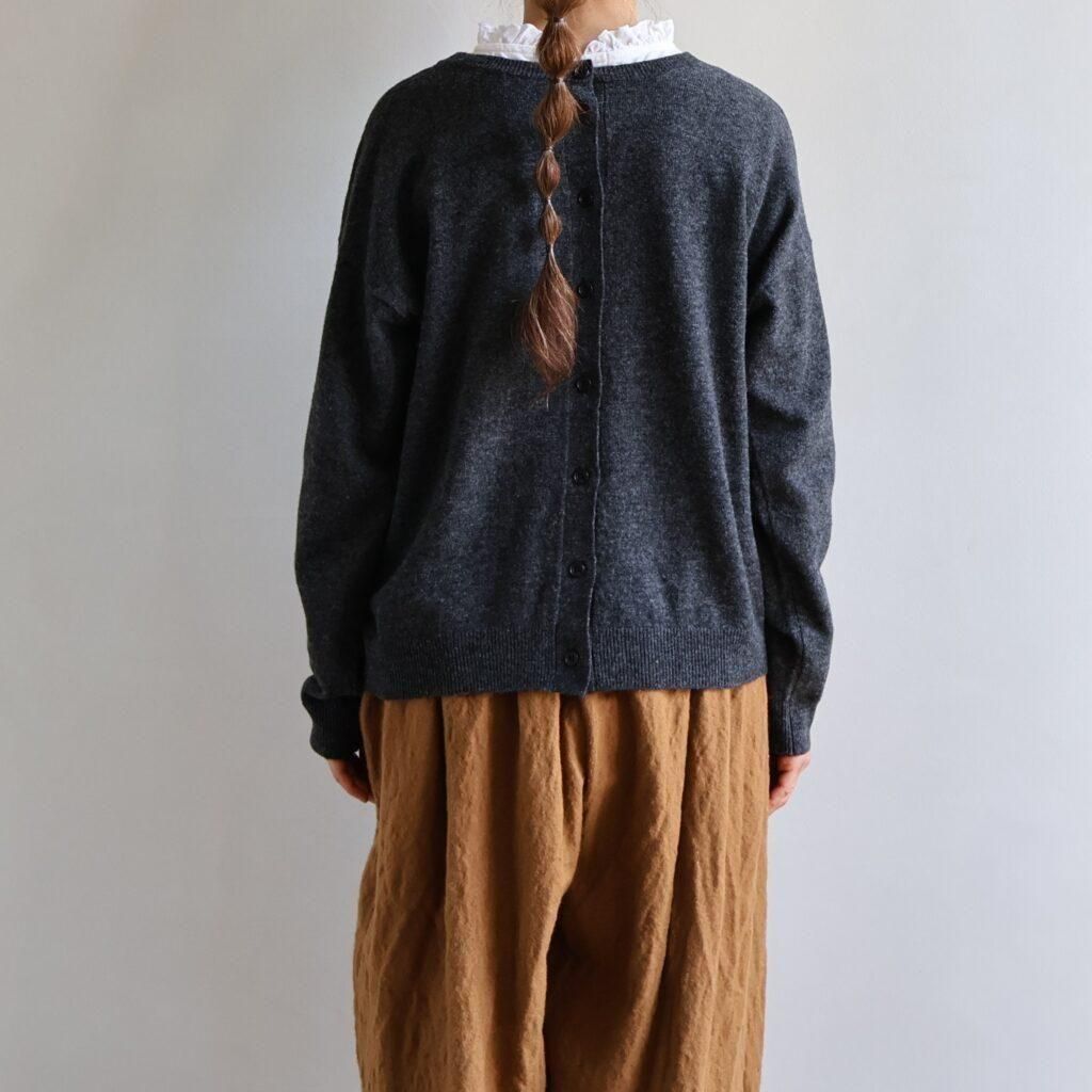 アイテムについて:ボタンあきの羽織りにも、シンプルなプルオーバーにもなる、前後2way仕様のプルオーバーニット。ほどよくゆとりを持たせたサイズ感とベーシックなデザインでデイリー使いに重宝します。素材にはRWS認証ウールを使用。やわらかく繊細な毛質のウールがやさしい着心地でふんわりと体を包み込みます。