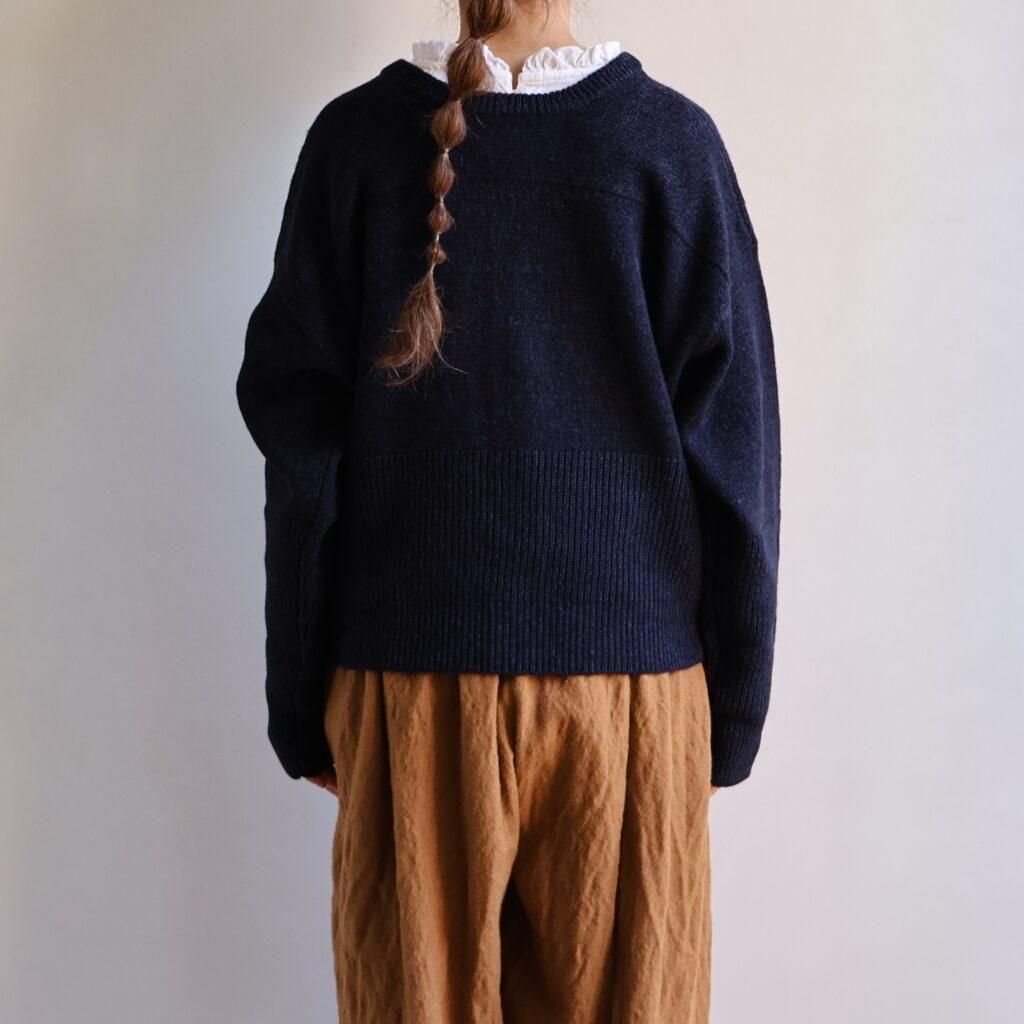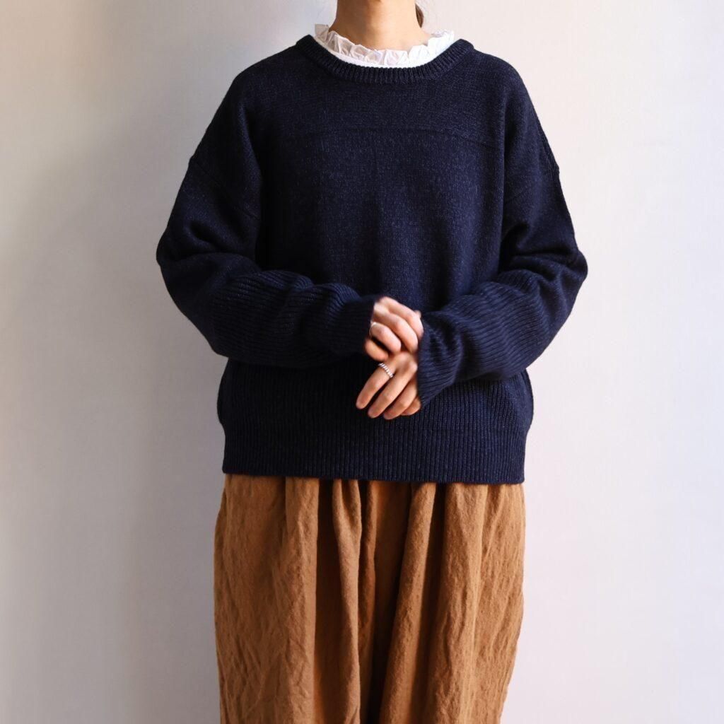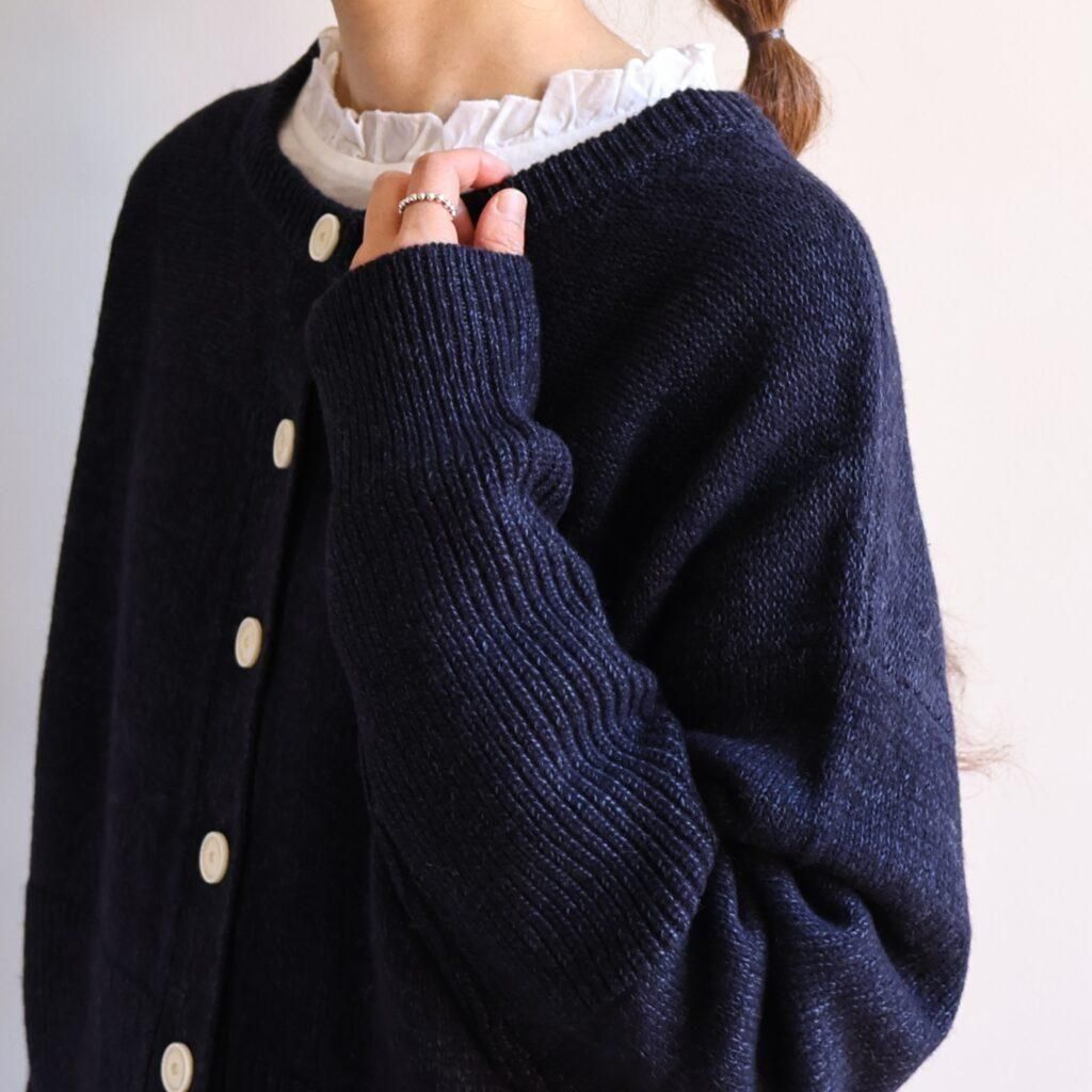 アイテムについて:プルオーバーとしても着こなせる前後2wayのカーディガン。ゆったりとしたワイドな身幅とドロップショルダーで、さまざまなインナーに羽織りやすくしています。素材はヨーロピアンリネンと内モンゴル産のウールを使用したオリジナルのリネンウール素材。リネンのシャリ感とウールの柔らかさを持ちあわせたナチュラルな風合いのニット生地になります。