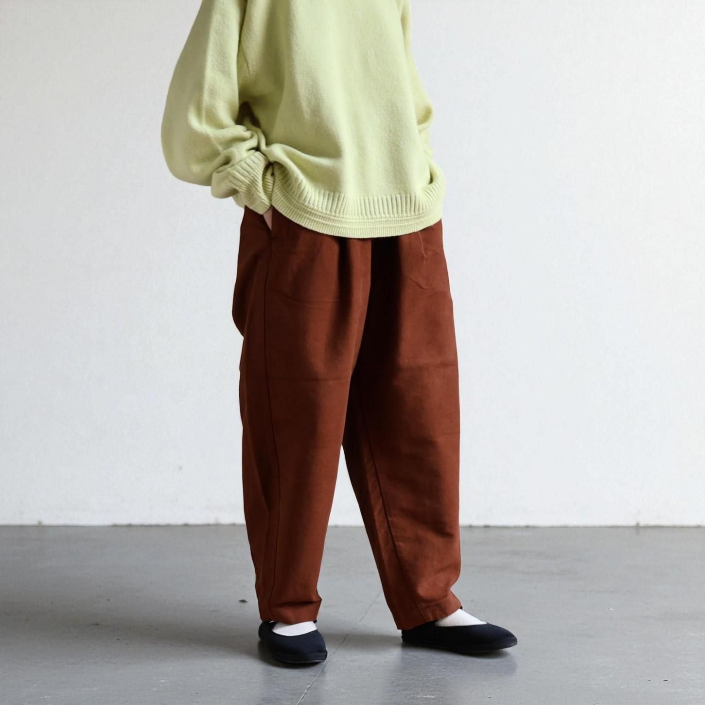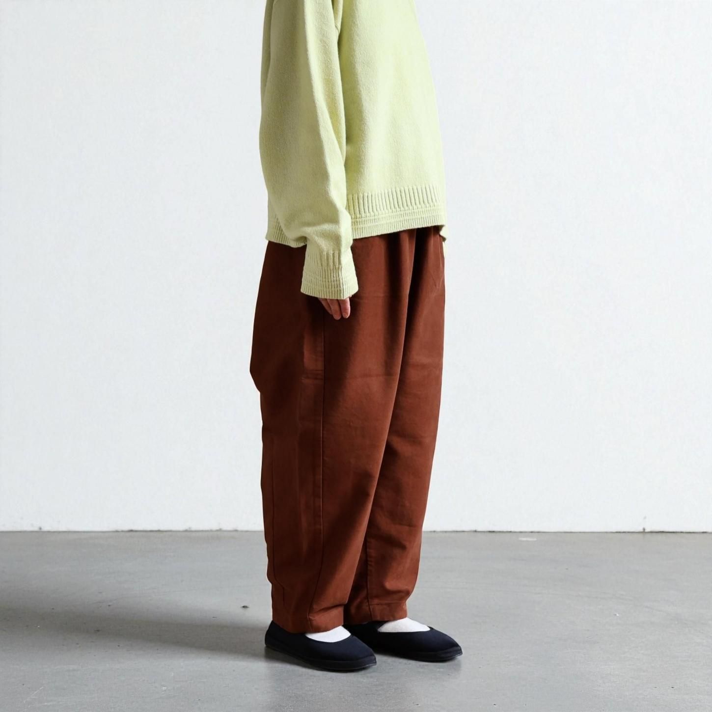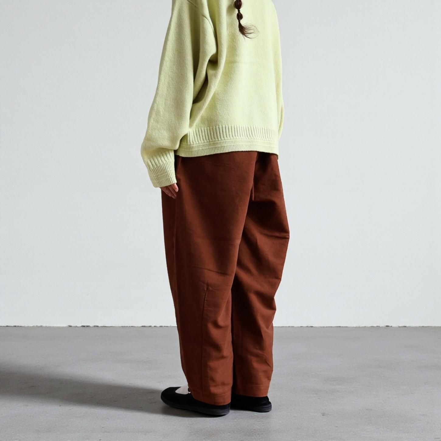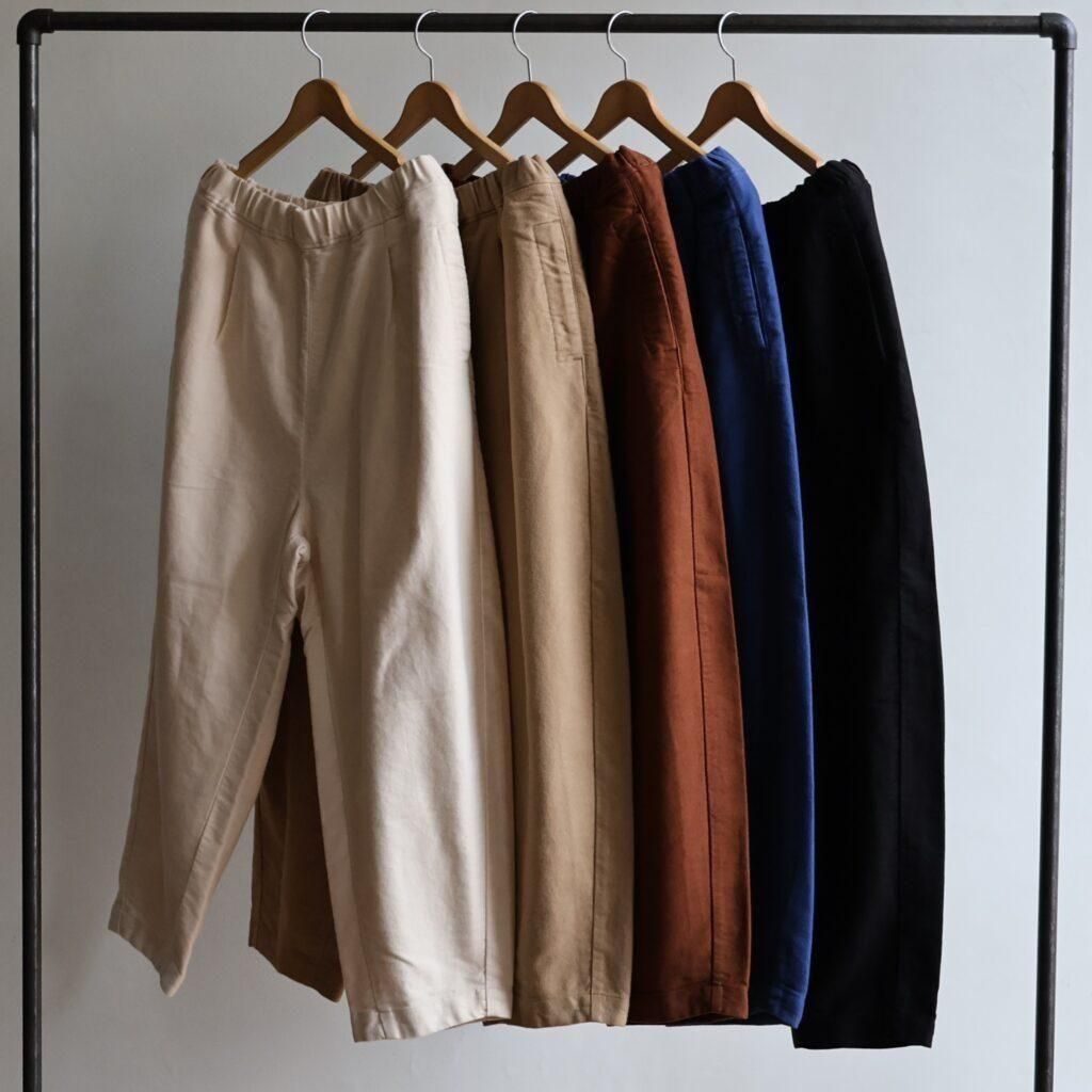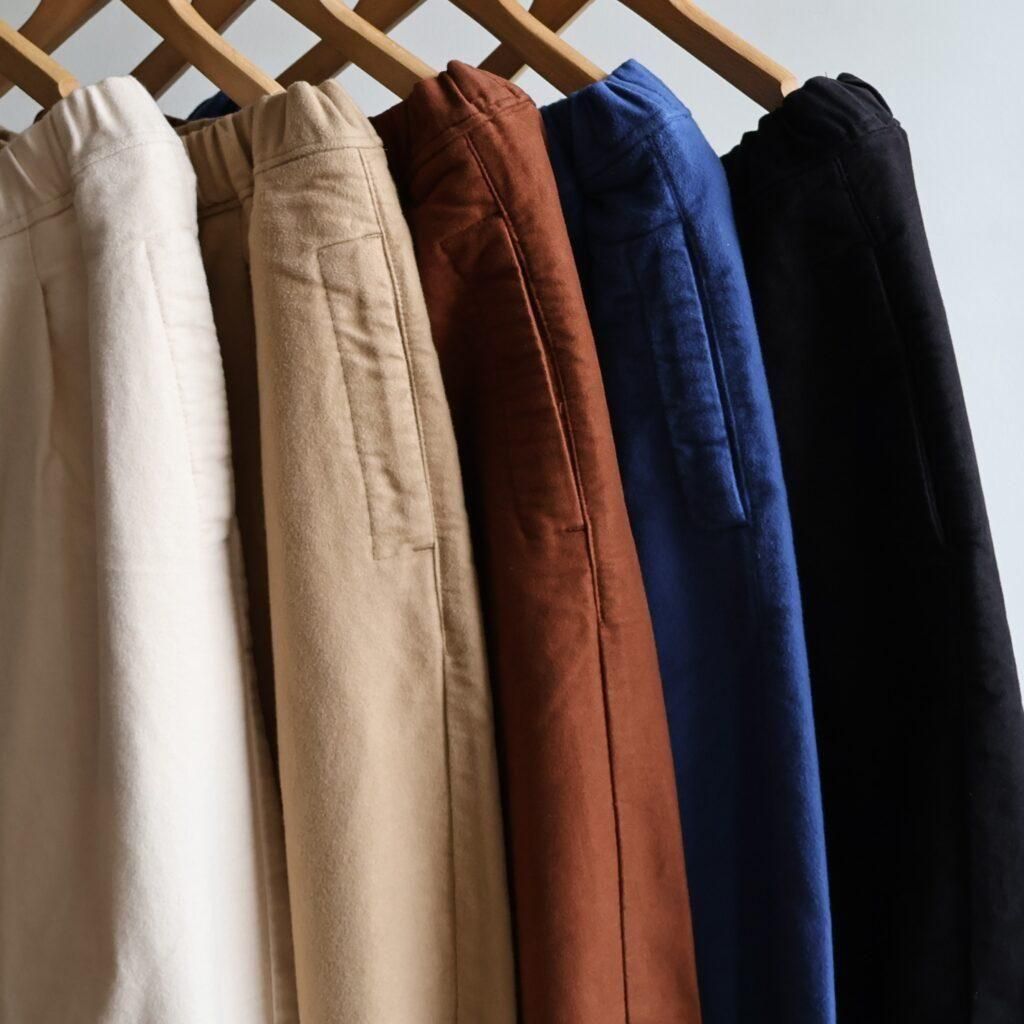 アイテムについて:緩やかな曲線を描くオーバルシルエットでイージーに着こなせるパンツ。オーガニックコットンを通常より甘く織り上げ、深起毛を施すことにより、特徴的な表面感としなやかで柔らかい風合いに仕上げました。肌に触れる内側も外側と同じくふんわりとした質感で、優しい温もりを感じられます。見た目にも上品なスエード調で、秋冬のコーディネイトを引き立ててくれます。